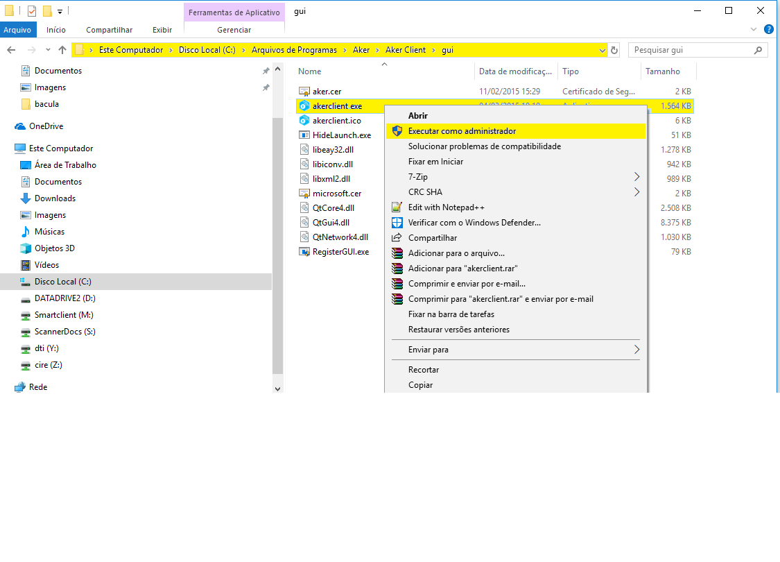 Depois de reiniciar execute o aker client como administrador para poder alterar as configurações do aplicativo. O caminho padrão é C:\Program Files\Aker\Aker Client\gui