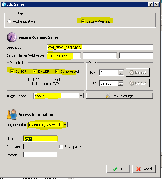 Faça as modificações conforme imagem abaixo. O parametro Domain deve ficar vazio. Recomendamos não salvar a senha neste cliente pois qualquer pessoa abrir o aplicativo irá conseguir conectar usando a senha salva.